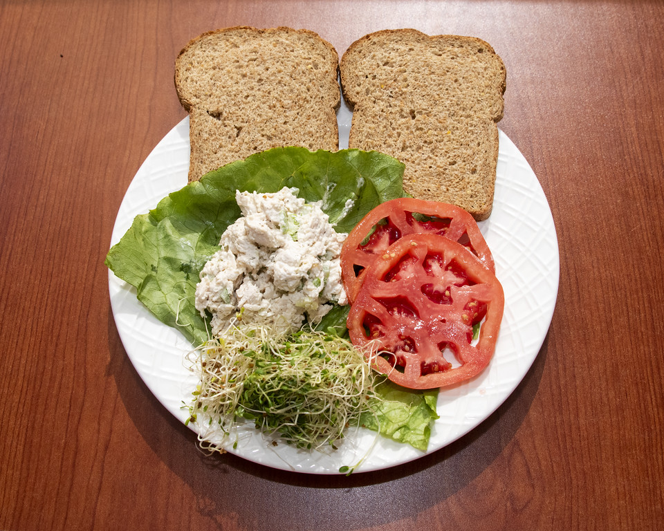 White meat Chicken Salad with Lettuce, Tomato, Sprouts.