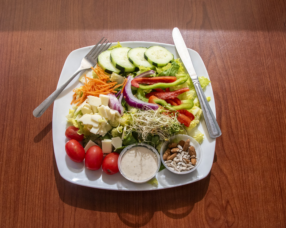Spring mix with Artichoke Hearts, Feta Cheese Black Olives, Tomato, Onions, Peppers, Cucumber, and Greek Dressing.